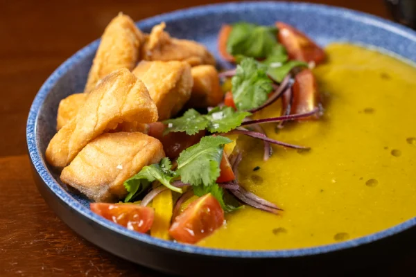 NUEVO Daditos de Salmón frito con Gazpacho picante