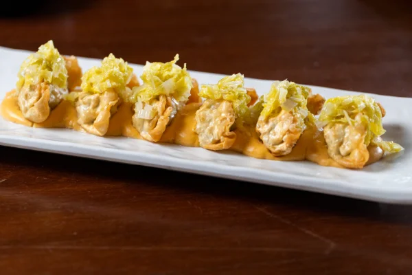 NUEVO Gyozas de langostino fritas con Bechamel de Kimchie y Col encurtida