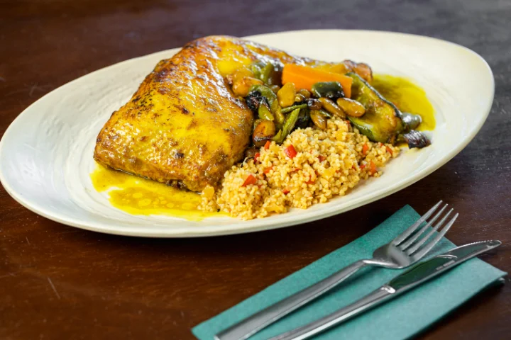 Couscous Salad, Mango, Soy Marinated Aubergines and Mustard Ice Cream